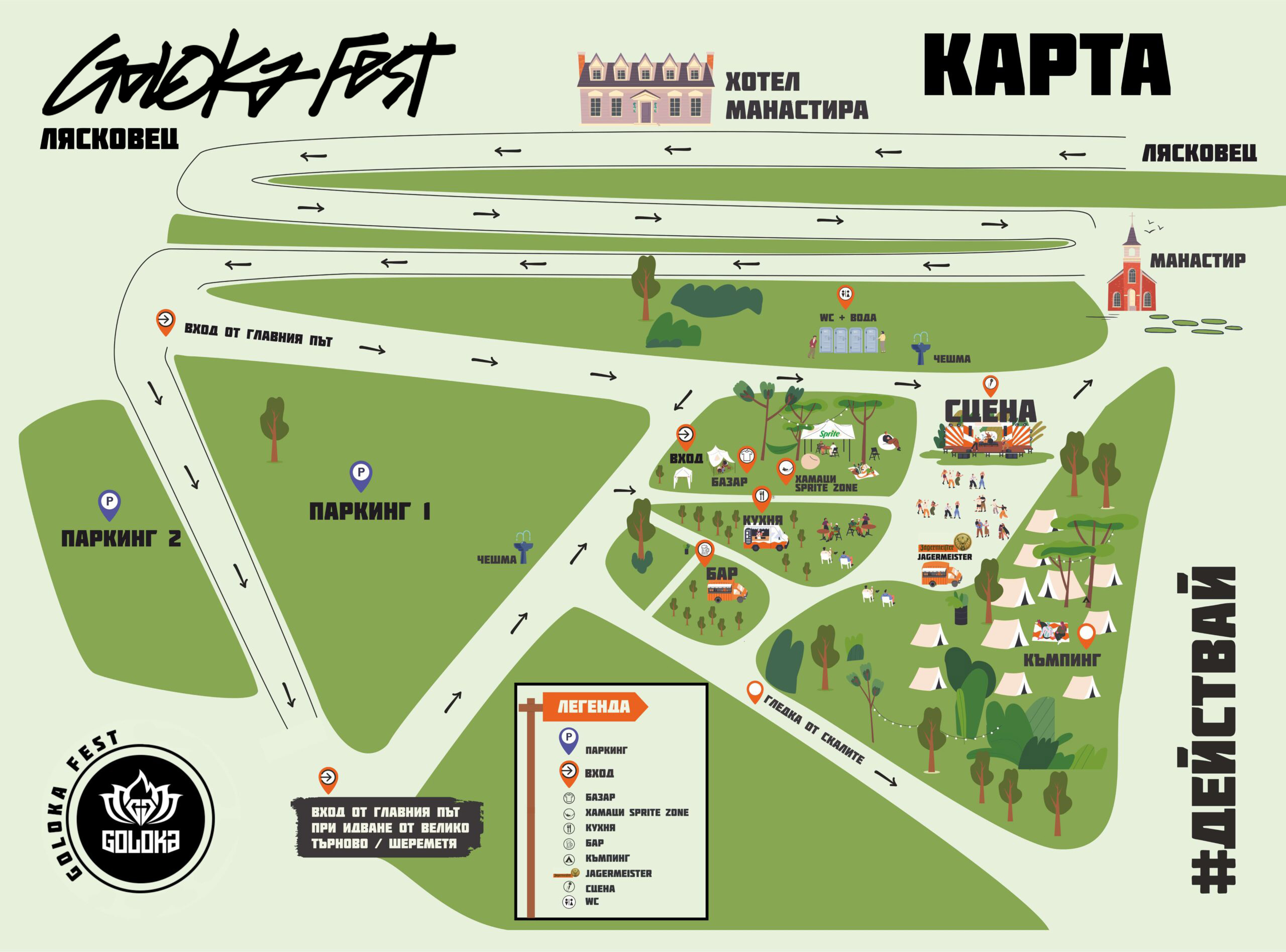 Фестивалната зона предоставя на нашите посетители: паркинг, течаща вода, бар, разнообразна кухня,